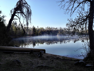 What a difference a day makes. I emerged from the tent to discover a solid coating of frost on the ground and gear. Fred was curled up in his sleeping bag, his toboggan cap pulled down tight over his head. Mist rose from a lake as smooth as polished crystal. Although it had been colder than 40 degrees the previous night, today’s weather would match the forecaster’s promise. The sky was clear. The sun was high. We had a light, following breeze, which was just enough to keep the mosquitoes and black flies at bay. Later, we would learn to loathe a south wind.