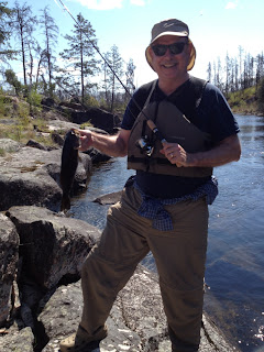 As we headed out for our second day on the river, Fred suggested that he paddle and I fish. Our first fish was a small Northern pike that came out from under a sunken tree to strike my lure. It was small and not something we wanted to eat. I was able to shake it off the hook at the side of the canoe to avoid bringing the toothy fish into the boat.