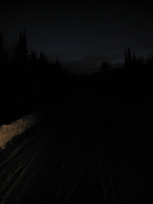 And then she came on another moose–a young male, with a smallish rack. He kept looking at us with such wide frightened eyes–actually, we could only see one monster eye at a time. Shelby slowed down, and took note of where she was–the straight stretch up by the Octagon House by Loon Lake—a safer-than-usual place to stop, so she did. We watched the guy go in the ditch, then trot up on the road, then the ditch, then the road, then he started slipping–it was comical, actually, but we did not want to rush him because it is a LOOOOOOOONG way for him to fall on the pavement. She turned off the brights to lessen his panic as he slid and trotted safely off the road. She handled herself well, not a close call, not even a little yelp.